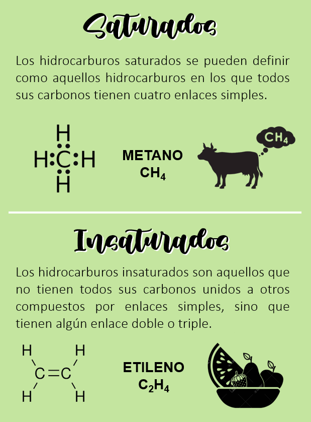 Hidrocarburos saturados: como vemos en la imagen de referencia, son aquellos compuestos que presentan todos sus enlaces C-C simples, entre ellos encomtramos a los alcanos.